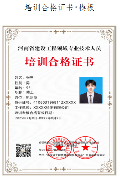 完成全部培训课程并通过考核的人员,河南省建设工程质量监督检测行业协会、河南省建设监理协会联合发放见证员、送样员、取样员培训合格电子证书,该证书可作为从业人员上岗和执业的资格证明。、