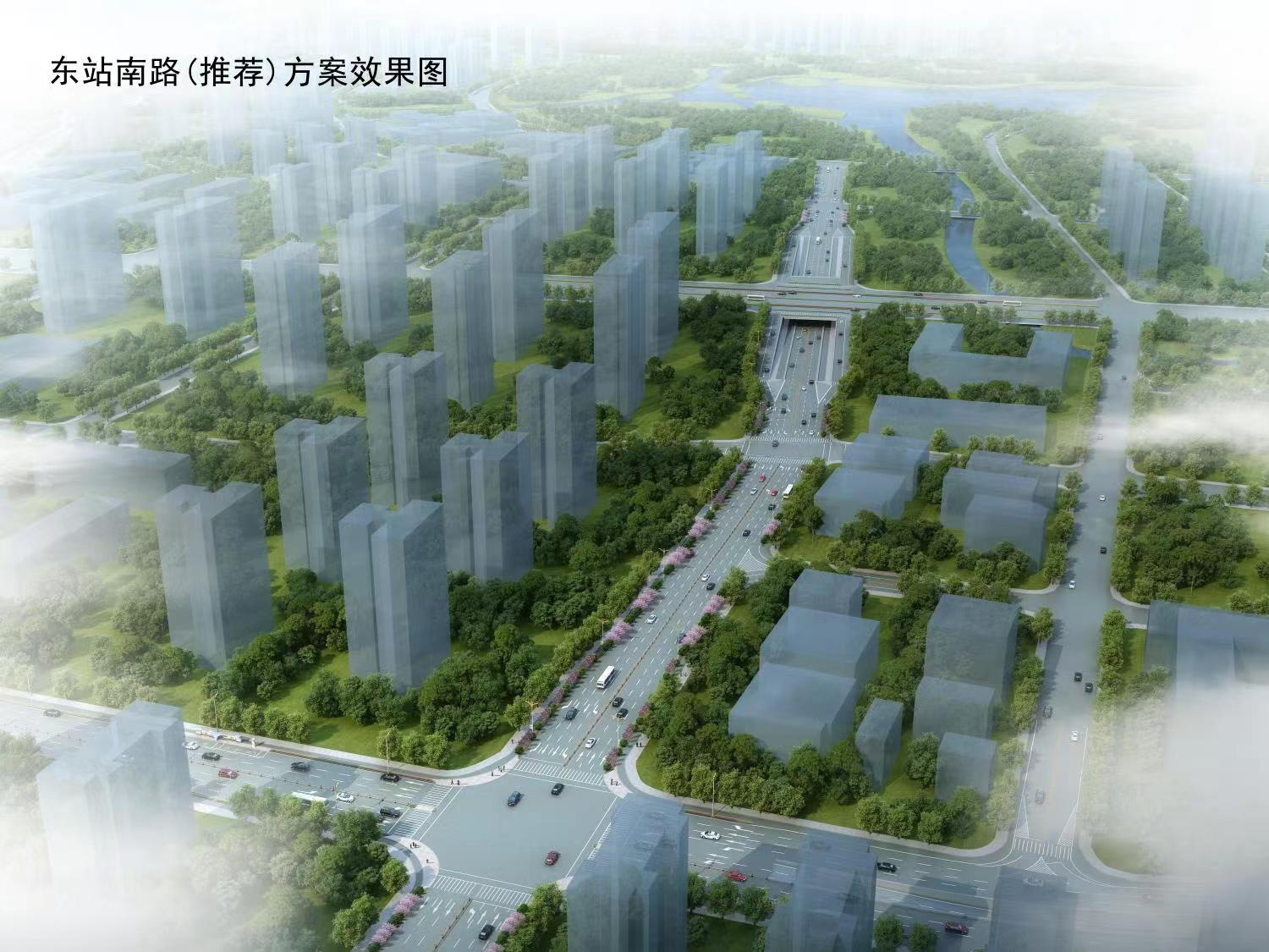 3)东站南路西起滨湖大道,东至站前三路,全长1220m,规划这城市次干路,道路红线为36m,双向6车道,天祥大道节点局部下穿采用双向4车道,设计速度为40km/h。